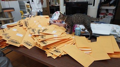 県政レポートDM発送準備は猫の手を借りました(笑)