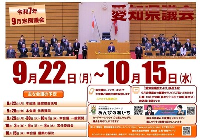 9月定例愛知県議会本会議代表質問はあいち県議団を代表して朝倉浩一幹事長が県政諸課題について質問し、知事、警察本部長、教育長が答弁されました。