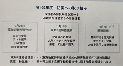 学校の特殊性からこの福祉避難所は在校生、卒業生を受け入れ、運用・運営はPTAが中心となって保護者が行うことです。