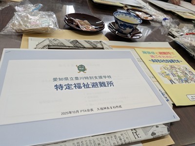 豊川市「愛知県立豊川特別支援学校」を訪問し、県下初の災害時に「特定福祉避難所(障害者の避難所)」に指定された経緯、運用、運営など市役所地域福祉課長、校長先生、PTA会長さんから伺いました。
