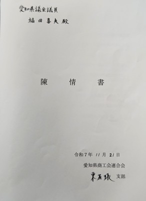 愛知県商工会連合会及び東尾張支部会長連名で支援拡充や会員事業者を取り巻く社会情勢について意見交換しました。