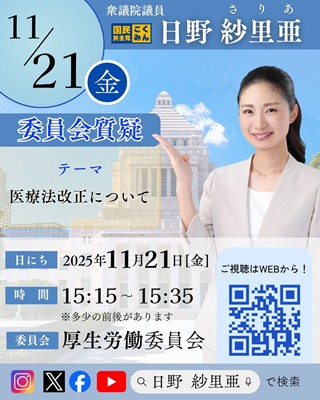 衆議院厚生労働委員会で日野さりあ衆議院議員が質問に立ちました。