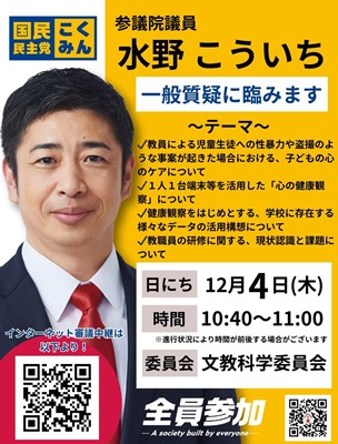 国民民主党 水野こういち参議院議員が12月4日に一般質疑に立ちました。