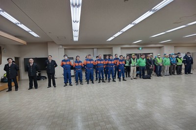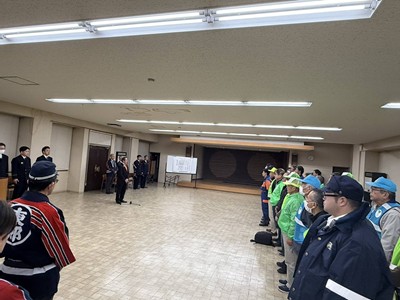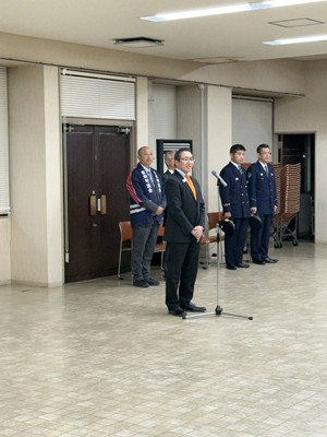 町内6分団と各地区防犯団体が一堂に会し、町長、議長、県議、消防署長、警察署長から激励をし、寒風の中、巡回パトロール、警備に向かいました。