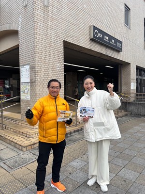 日野紗里亜衆議院議員と赤池駅前でチラシを配布しながらご挨拶させていただきました。