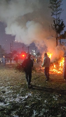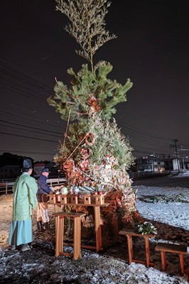 天気予報どおり降雪の早朝、日進市折戸区の「左義長」にお招き頂きました。