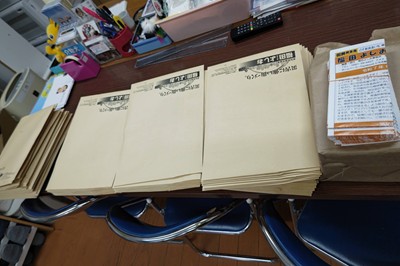 事務所へ戻り県政レポート大口124通(1550部)の封筒詰め作業しました。