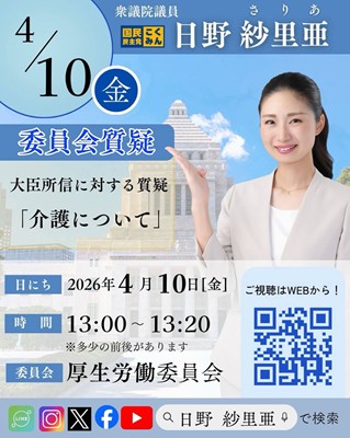日野さりあ衆議院議員が厚生労働委員会で質疑を行いました。