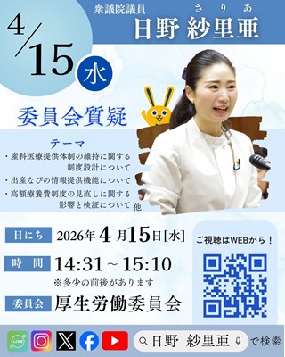 日野さりあ衆議院議員が厚生労働委員会質疑